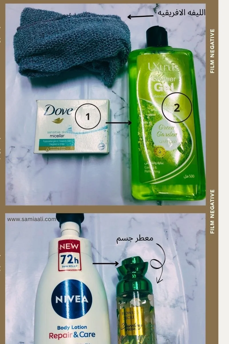 السنه الي فاتت بداءة استخدم الليفه الافريقيه، سمعت عنها كثير ولما جربتها صراحه مستحيل ارجع استخدم الليفه العاديه لعدة أسباب. اولا تنظف البشرة وثانيا فرقت معاي بملمس الجلد ثالثا تجلس مدة سنه في الاستخدام واقدر اغسلها في الغساله ورابعا سعرها جدا حلو اشتريت مجموعه فيها ثلاث قطع بثلاثين ريال يعني الوحده بعشره ريال. في شغله ثانيه بداءة اسويها من السنه الي فاتت والي هي الاستحمام مرتين عرفت ان اذا استحمينا مره وحده الجسم يكون لسى مو نظيف ويكون فيه اوساخ وعرق وجلد ميت في البشره فيصير تطلع روائح في الجسم خاصه الي عانون من هذا الامر. لكن لما نستحم مرتين اول مره يبدا يفتح المسام ويبدا الجلد الميت والاوساخ تتحرك. والاستحمام الثاني هو الي ينظف الجسم. شفت اقتراحات للمنتجات بالاستحمام الأول والثاني طبعا مو اجباري نقدر نستعمل صابون واحد في المرتين لكن انا أحب أجرب. شفت انهم يقترحون ان نستخدم صابون مضاد للبكتريا عشان يقتل الجراثيم في الاستحمام الأول، اما الثاني يكون جل استحمام عشان يرطب الجسم ويعطره. فا اول الاستحمام صرت استخدم صابونة دوف(مو مضاد للبكتريا ولكن ينعم الجسم) والثاني جل استحمام، واحيانا ما عندي وقت ولا طاقه فا استخدم جل الاستحمام فقط. بعدها اقفل مسام الجسم بمويا بارد قد ايش هذي الخطوه رهيبه انا مجربتها أكثر شيء لشعري. واخر شي ادهن جسمي واحط عطر للجسم. انصح بهذي التجربة خاصه لو توحدين روائح الصابون مع عطر الجسم رح يخلي ريحة المنتجات تبقى فتره طويله عليك غير ان بسبب طريقة الاستحمام هذي رح تحسين بانتعاش بجسمك لفتره طويله تحسين إنك نظيفه حتى اليوم الثاني