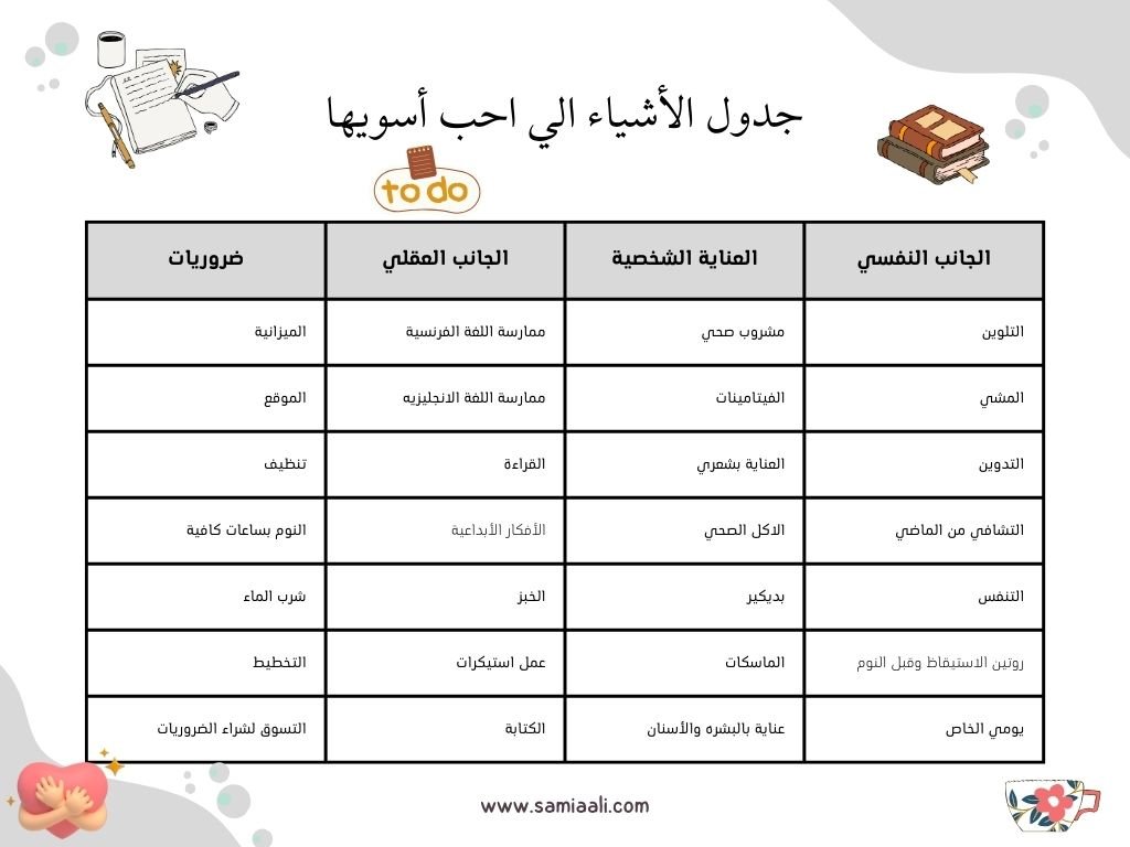 ما علينا طلعت من الموضوع الاساسي كالعادة 😅 اسفه شتتكم ، المهم جبت النوتة العشوائية جداً وسويت فيها جدول وسميته جدول الأشياء الي احب اسويها وطبعاً كلها من لوحة الامنيات 😙. فحطيت هواياتي كلها و العناية الشخصية تعتبر عناية جسديه وصحه . عناية نفسية وضروريات طبعا ضروريات تشمل الميزانية الموقع يعني مخليتها بالجانب المادي وكذا. فقمت سويت عمليه حسابيه بهذا الشكل الأمنية + الهدف+ طريقة تحقيقها= الشعور النهائي، مثلا عناية شخصية يندرج تحتها عنايتي بشعري الهدف منه يكون شعري صحي طويل وكثيف و تحقيق الهدف يكون عن طريق روتيني لشعري الأسبوعي والشهري. الشعور اني احس بشعور الحب والجمال كل ماشوفه. طبعا انا اروح للدفتر الي اراجع فيه امنياتي واكتب جدول للعناية بشعري شهري واسبوعي بمعنى كم مره اغسل شعري وكل غسلة أي ماسك احط بروتين او ترطيب وانا حاطه جدول للعناية بشعري بالصيف والشتاء كمان ماشاء الله. فخلاص يصير اراقب هل انا ماشيه صح بروتيني فيه او لا وإذا فيه تغيير او تراجع اكتب في الدفتر عنه. المهم انا جلست اكتب كل هذا على أيام يعني مو بنفس اليوم عشان أحمس نفسي وارجع لروح النشاط الي قبل ما شاء الله و جداً فادني صراحه