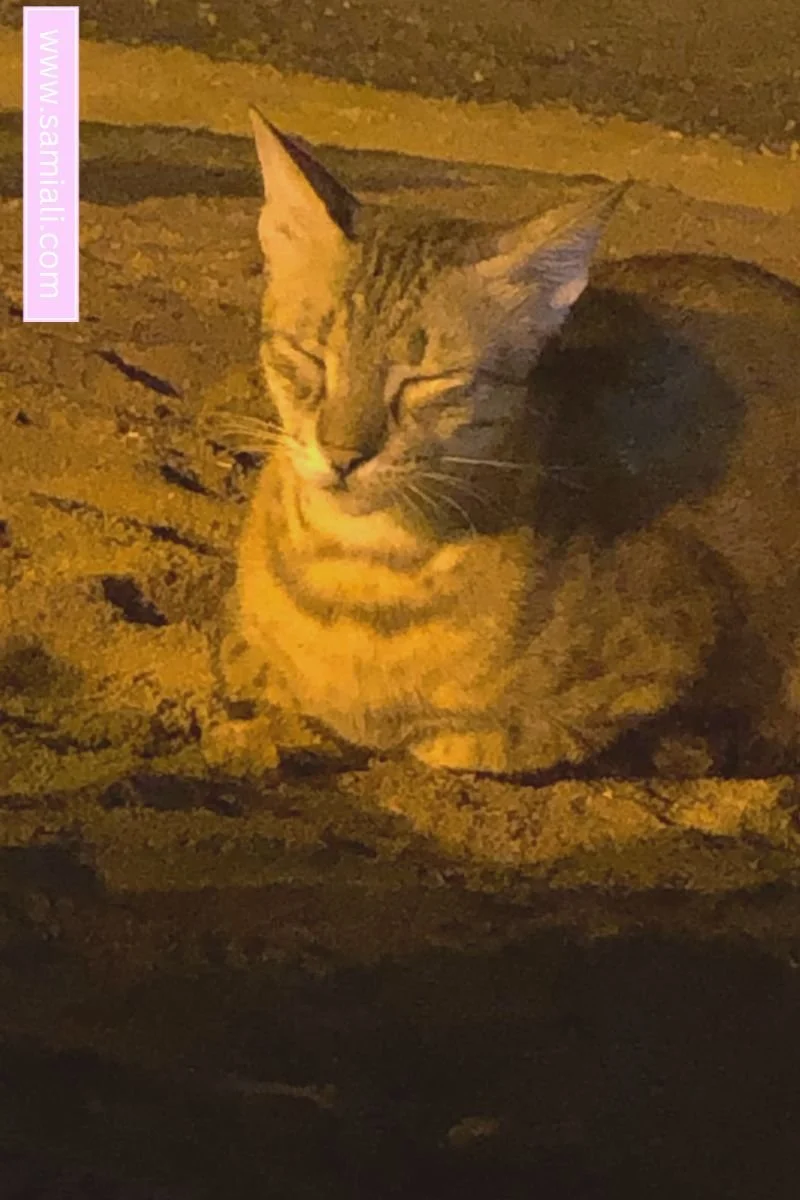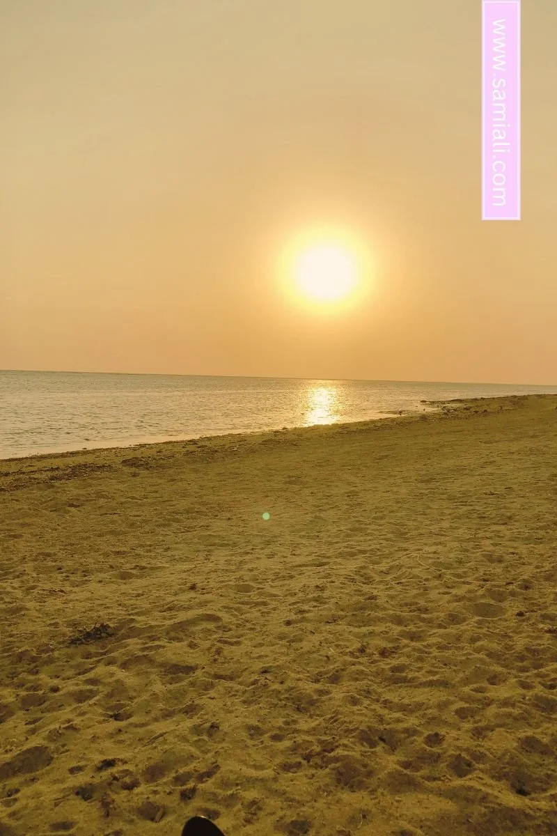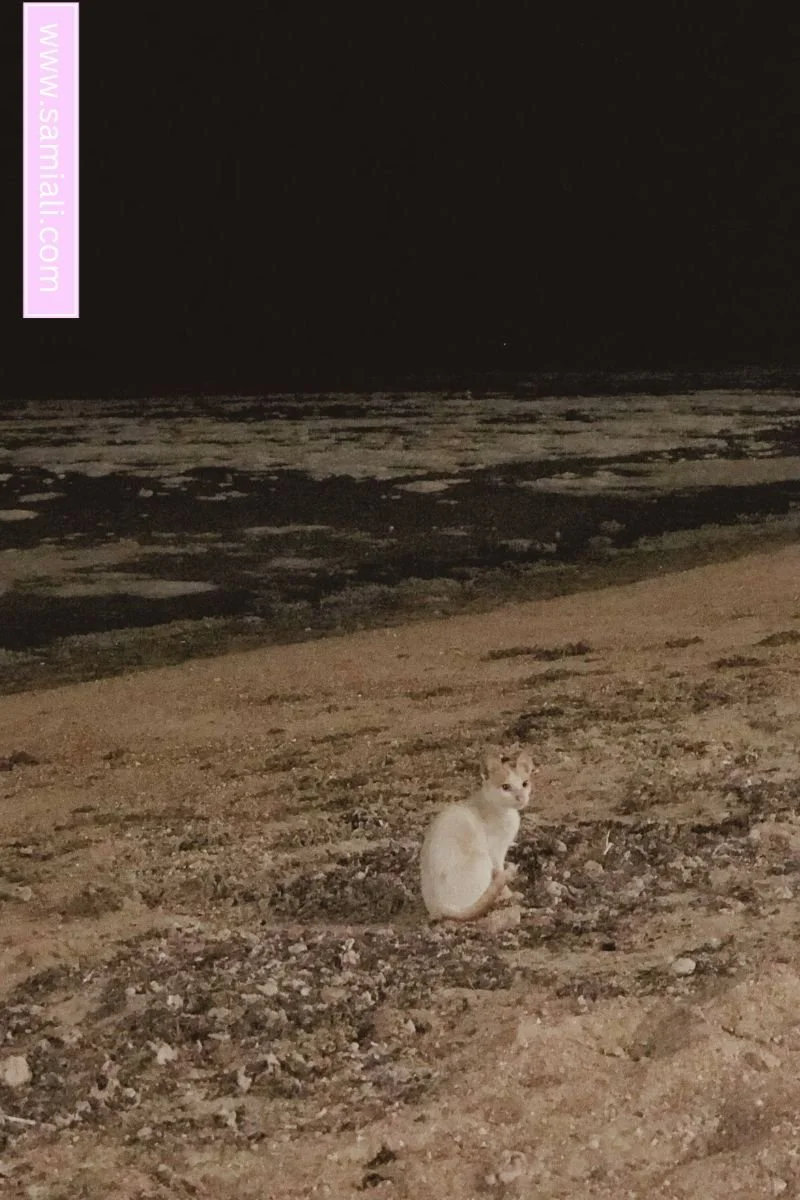 There were three cats, one male and two females. They all looked alike, and they were super friendly and playful, especially one of them – she walked with us, meowed with cuteness, then lay down and rubbed her body on the sand to show us some affection. However, the weather here is changeable; everything happens in one minute once it is breezy and hot. I'm happy because This is the First time I have stayed late with the sea.